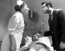 Foto de abajo Willie Gingrich, el que de pie se enfrenta a la enfermera, a quien quiere engañar con una elaborada trama para llevarse así un dinerito.