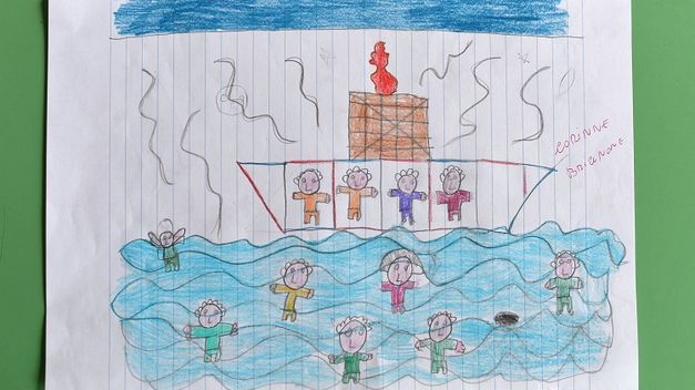 primero, y no incluye foto de naúfragos vivos y muertos porque al menos prefiere respetar su imagen. Prefiere ilustrar con lo que recogió una web: uno de los dibujos de niños pequeños de la escuela de Lampedusa, dibujado al día siguiente del naufragio
