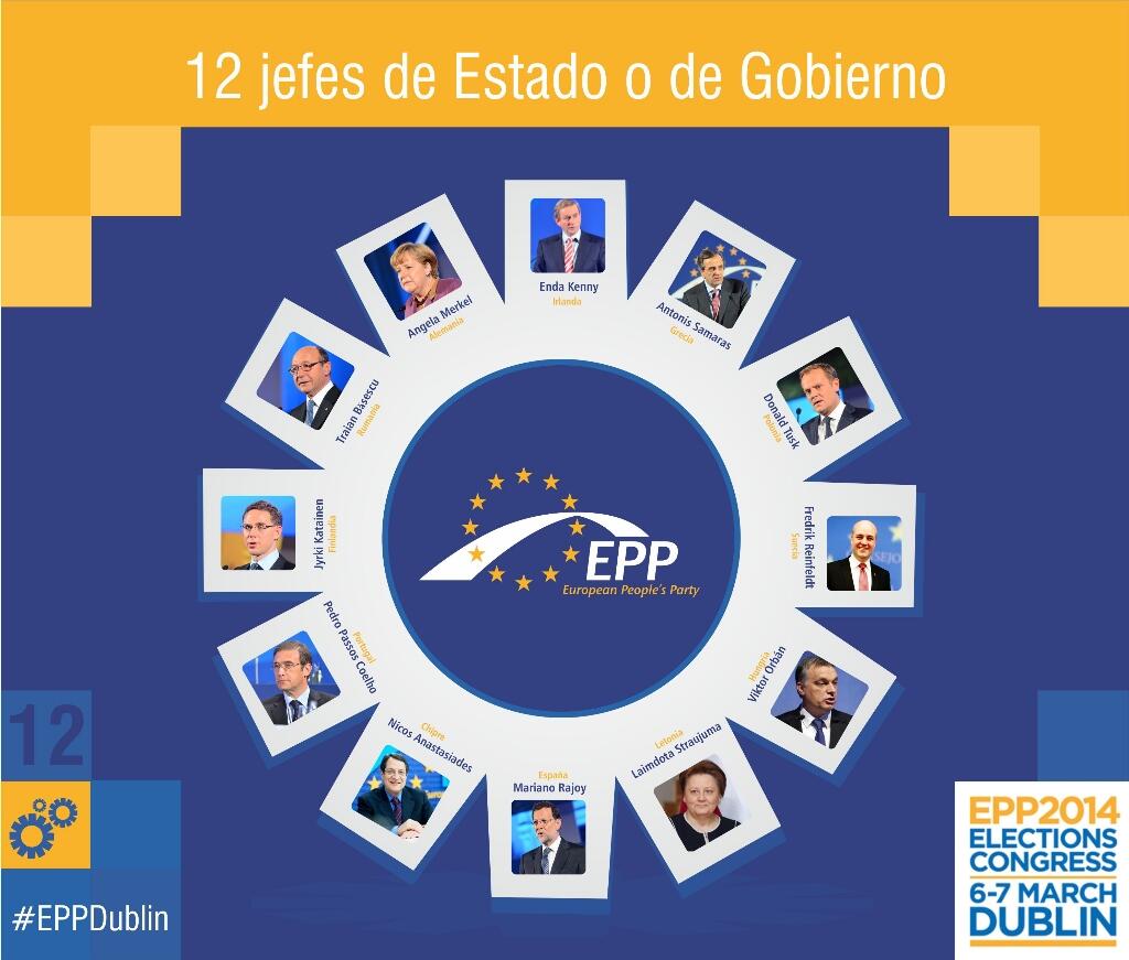 Imagen difundida en marzo de 2014 por la cuenta oficial en Twitter del Partido Popular Europeo con el siguiente texto: «12 jefes de Estado o de Gobierno europeos asisten al Congreso del PPE en Dublín». Según se observa en la imagen, de 12 personas, 2 son mujeres.