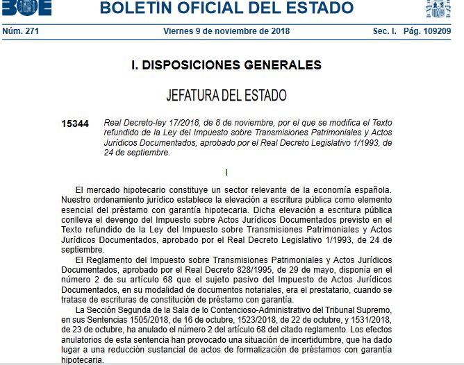 Observaciones sobre la reforma del impuesto de Actos Jurídicos Documentados en relación con préstamos hipotecarios por Real Decreto-ley 17/2018, de 8 de noviembre